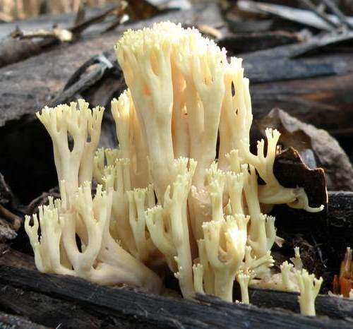 Fruiting body: Varying, up to 10 cm in width and 13 cm in height. For principal branches, the branch repeats are up to 5mm thick; however, subsidiary branches are thinner. Creamy white to pale yellow, occasionally whitish pink, with brownish branch tips. With time, the coral fungus turns browner. flesh with a pliable but strong feel. The mushroom’s base where it adheres to wood is brown.